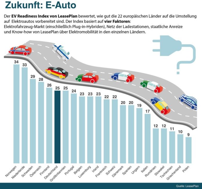 Der Index basiert auf vier Faktoren, die eine Gesamtwertung für jedes Land ergeben: Elektrofahrzeug-Markt (einschließlich Plug-in-Hybriden), Lade-Infrastruktur, staatliche Anreize und Know-how von LeasePlan über Elektromobilität in den einzelnen Ländern. In der Wertung erreicht Deutschland den sechsten Platz mit 25 Punkten, Norwegen kommt mit 34 auf die höchste Gesamtpunktzahl und Schlusslicht im Ranking ist Polen mit 9.