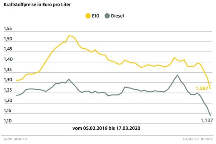 München (ots) – Angesichts der weltweiten Coronakrise und der einbrechenden Rohölnotierungen geben die Spritpreise an den Tankstellen deutlich nach. Laut aktueller Auswertung des ADAC kostet ein Liter Super E10 im Bundesmittel 1,267 Euro, das sind 5,8 Cent weniger als in der Vorwoche. Diesel verbilligte sich um 4,1 Cent auf durchschnittlich 1,137 Euro je Liter.