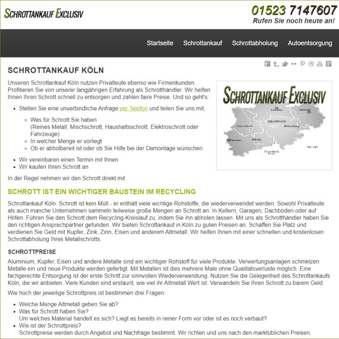 Mit einem umfangreichen, zuverlässigen Service sorgt das Team von Schrottankauf Exclusiv dafür, dass Privat und Gewerbe auf einfache und bequeme Weise ihren Schrott entsorgen können. Zur Kontaktaufnahme und Terminvereinbarung reicht ein Telefonat oder auch eine E-Mail. Bei der Terminvergabe ist das Team flexibel und kann dadurch in der Regel auch schnell einen kurzfristigen Wunschtermin vereinbaren. Die Mitarbeiter sind pünktlich direkt vor Ort, um den Schrott dort abzuholen: im Privathaushalt, auf dem Firmengelände, im Betrieb oder auf der Baustelle. Der Schrott wird an Ort und Stelle sortiert, aufgeladen und abgefahren. Damit endet der Service aber noch nicht: