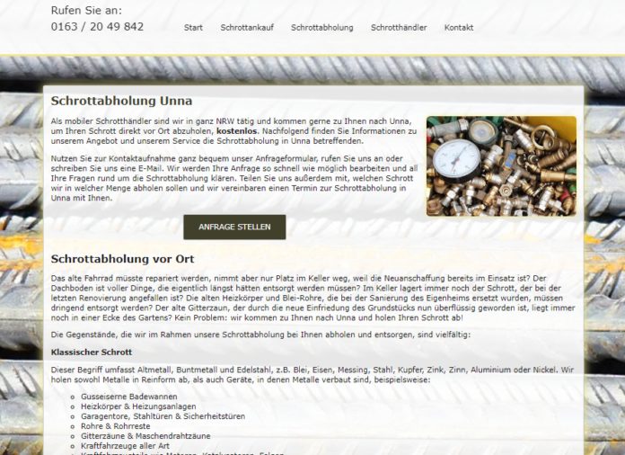 Wer träumt schon von einem „vollgemüllten“ Grundstück oder Keller? Sicherlich niemand. Dennoch stapelt sich gerade in versteckten Ecken der Altmetallschrott nach dem Motto: aus den Augen – aus dem Sinn. Natürlich ist man jedes Mal voller guter Vorsätze, wenn einem diese Schandflecke ins Auge fallen. Doch ebenso schnell sind sie wieder vergessen, weil man zum Tagesgeschäft übergeht. Dabei kann es so einfach sein, den Altmetallschrott loszuwerden: mit der Schrottabholung Unna . Von ihr können sich die Kunden ihren Schrott ganz einfach abholen lassen. Selbstverständlich kostet diese Leistung die Kunden keinen Cent.