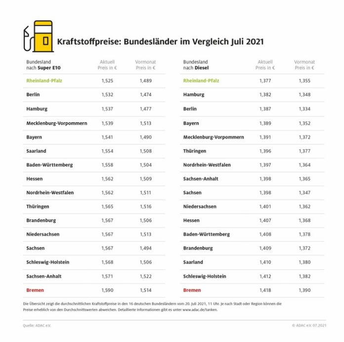 München (ots) – Autofahrer müssen beim Tanken aktuell in Bremen am meisten bezahlen, sowohl Super E10 mit 1,590 Euro als auch Diesel mit einem durchschnittlichen Literpreis von 1,418 Euro sind dort im Bundesländervergleich am teuersten. Die heutige ADAC Auswertung der Kraftstoffpreise in den 16 Bundesländern zeigt außerdem, dass Sprit beider Sorten in Rheinland-Pfalz am günstigsten ist. Ein Liter Super E10 schlägt hier mit 1,525 Euro zu Buche, Diesel mit 1,377 Euro. Damit liegt die Preisdifferenz zwischen dem teuersten und dem günstigsten Bundesland für Diesel bei 4,1 Cent, bei Benzin ist der Preisunterschied mit 6,5 Cent sogar noch größer.