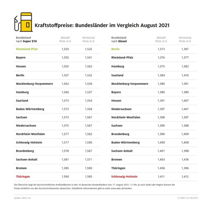 München (ots) – Die Fahrer von Benziner-Pkw tanken derzeit in Rheinland-Pfalz am günstigsten. Das zeigt die heutige ADAC Auswertung der Kraftstoffpreise in den 16 Bundesländern. Diesel ist momentan in Berlin am preiswertesten. Um vier Cent teurer als in Rheinland-Pfalz ist Benzin laut ADAC in Thüringen, Diesel-Fahrer tanken in Schleswig-Holstein am teuersten.