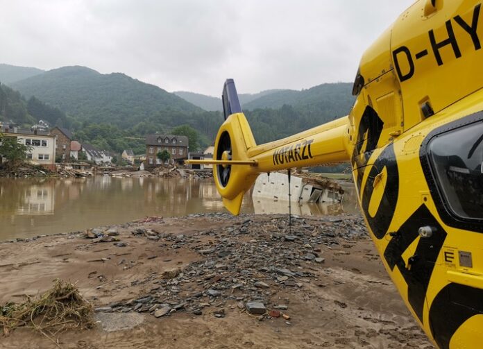 Im Einsatz waren auch die öffentlich-rechtlichen ADAC Rettungshubschrauber aus Wittlich und Koblenz in Rheinland-Pfalz sowie Köln und Aachen/Würselen in Nordrhein-Westfalen. „Christoph Europa 1“ aus Aachen war zum Beispiel einer der ersten Hubschrauber bei der Evakuierung des St. Antonius Hospitals in Eschweiler. Die Crews der ADAC Luftrettung hatten in den ersten Tagen auch überschwemmte Keller und Wohnungen nach Verletzten und Überlebenden durchkämmt sowie später Hundestaffeln der Polizei bei der Suche nach Vermissten unterstützt und von der Außenwelt abgeschnittene Bewohner mit Medikamenten versorgt. „Was uns die Crews von ihren Einsätzen berichtet haben, hat uns alle sehr bewegt und betroffen gemacht“, sagte Bruder.