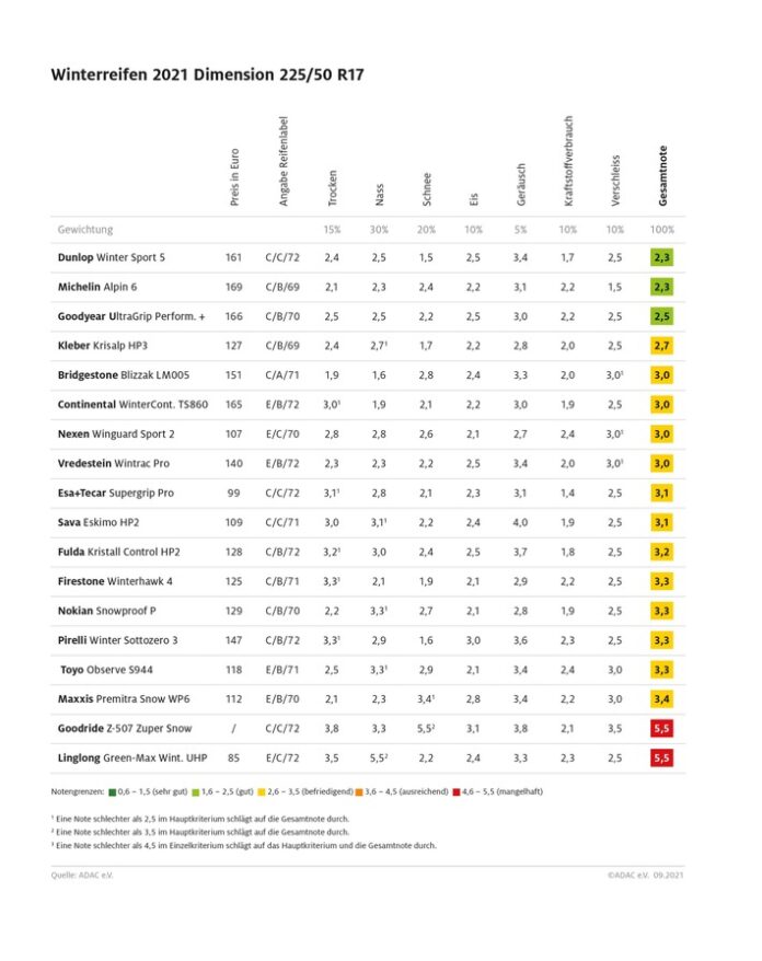 München (ots) – Bei den 18 Reifen der Dimension 225/50 R17 gab es drei gute Modelle, 13 befriedigende, aber auch zwei mangelhafte. Bei den 16 Reifen der Dimension 195/65 R15 sieht es etwas besser aus: Hier schnitten vier Modelle „gut“ ab, elf „befriedigend“ und eines „ausreichend“. Getestet wurden Winterreifen für Mittelklasse-Pkw wie 3er BMW oder Audi A4 und Modelle für die untere Mittelklasse (Kompaktklasse) wie VW Golf oder Opel Astra.