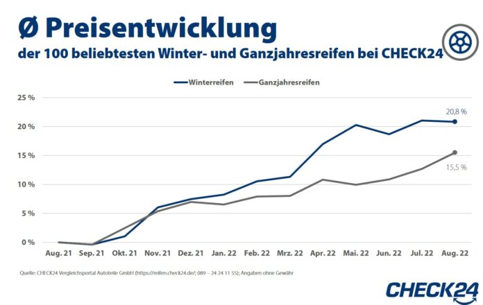 - Ganzjahresreifenpreise im Vergleich zu August 2021 um knapp 16 Prozent gestiegen