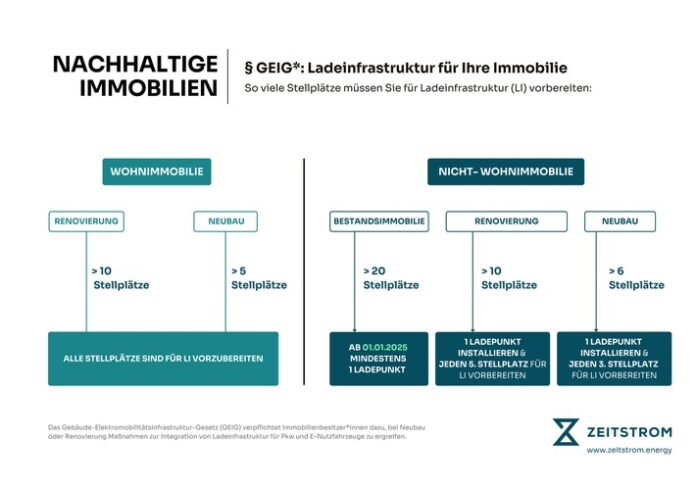 Für Immobilienbesitzer ist es häufig nicht leicht, bei dem komplexen Gebäude-Elektromobilitätsinfrastruktur-Gesetz den Durchblick zu bewahren. Aus diesem Grund hat der auf Immobilien spezialisierte Full-Service-Anbieter für Ladeinfrastruktur ZEITSTROM die zentralen Aussagen des GEIG in einer anschaulichen Grafik und einem FAQ zusammengefasst.