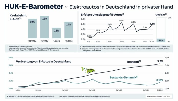 Private Autofahrer entscheiden sich nach langer Zurückhaltung wieder vermehrt für Elektroautos. Im zweiten Quartal 2025 stiegen laut HUK-E-Barometer rund ein Drittel mehr beim Fahrzeugwechsel von einem Verbrenner auf ein reines E-Auto um als im Quartal zuvor. Insgesamt waren es bundesweit 5,5 Prozent aller Fahrzeugwechsel (4,1% in Q1 2025). Einen Wert in ähnlicher Höhe gab es zuletzt Ende 2023, also vor dem Wegfall der staatlichen Kaufprämie. Und auch der Gesamtbestand an privaten E-Autos hat im zweiten Quartal 2025 spürbar angezogen auf 3,2 Prozent. Die Dynamik der Bestandszunahme ist damit ebenfalls die höchste seit mehr als einem Jahr.